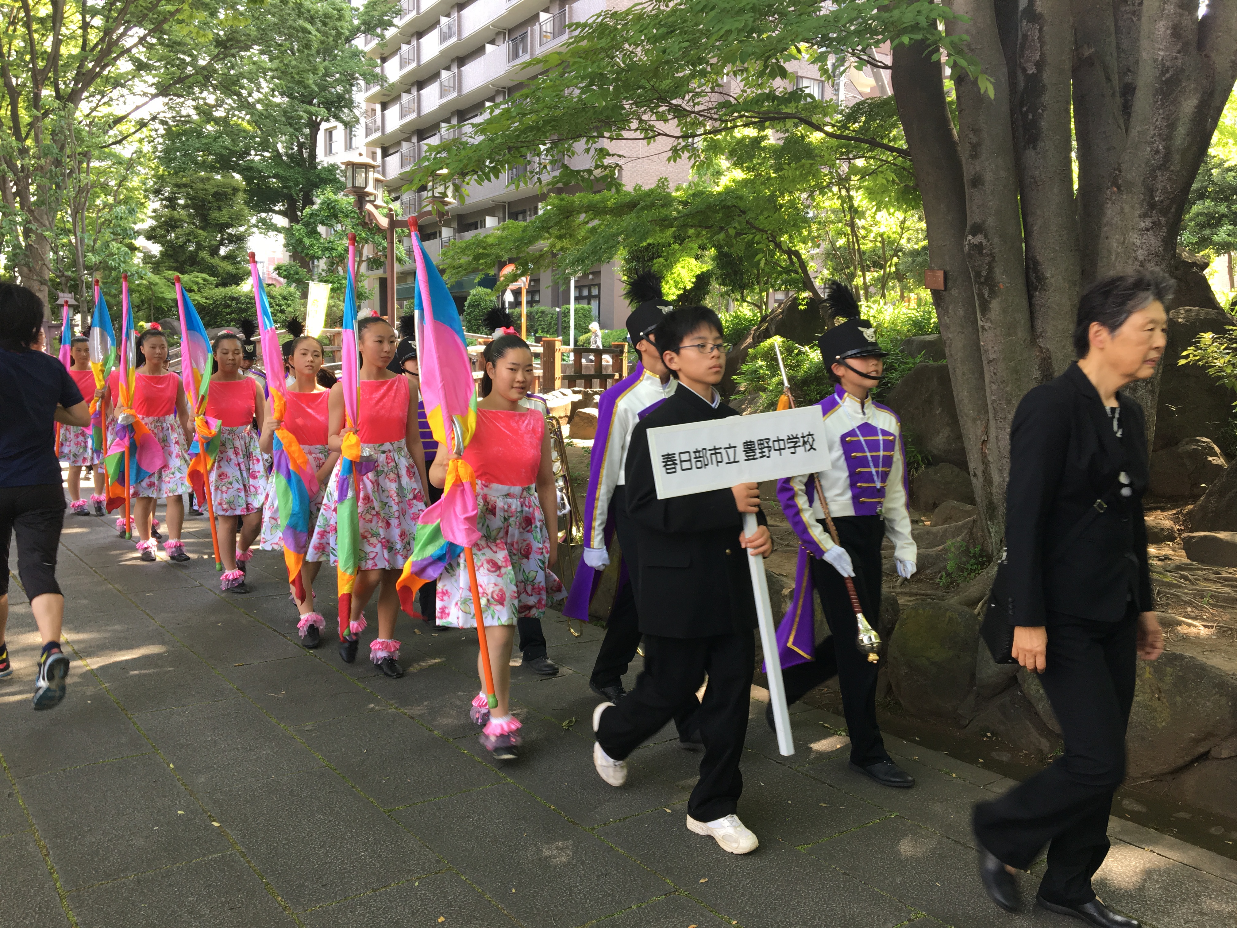 こちらは上記の春日部市立豊野中の出発の模様。ミッキーマウスのマーチや春日部らしくクレヨンしんちゃんの「オラはにんきもの」で通りを盛り上げてくれました。