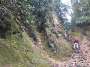 そんなわけで案内に従って本堂の裏手に出ると、なにやら急な斜面が…。