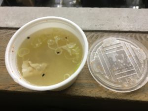 1杯¥150とお手頃な価格ながら、身体も温まりこの時期には外せない一品だ。弁当類と一緒だと¥100で購入できるのも人気の秘訣か。