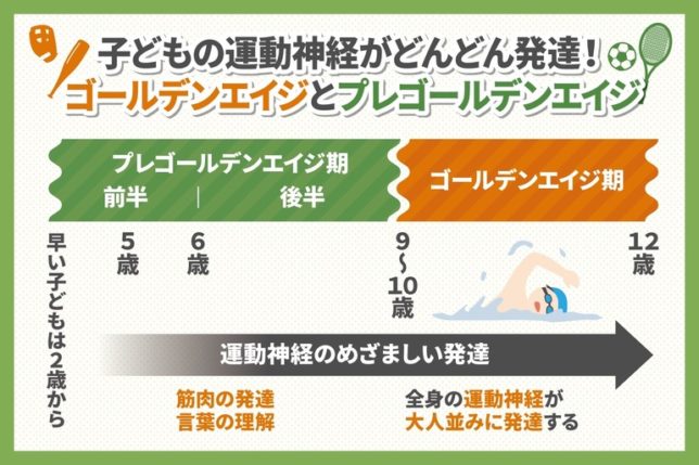 この発達期間はプレ・ゴールデンエイジと呼ばれ、 12歳で神経系の発達はほぼ100%で⼤⼈と同等になる。⼀⽣に⼀度のこの時期に沢⼭の動きやリズムを経験することで脳が活性化されて体が思い通りに動くようになる。