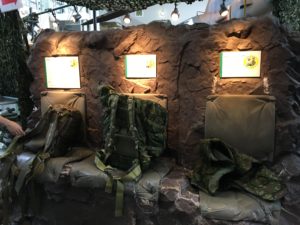 2フロアから成る館内に入ると、すぐ飛び込んでくるのがリュックや防弾チョッキといった自衛隊の装備品。