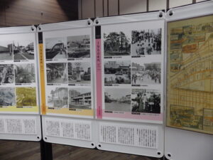 同行の歩みだけでなく、さいたま市デジタルアーカイブスなどから、創業の地である大宮の歴史写真を展示。同行が創業した1950年代から2000年代まで、地域の移り変わりを写真で紹介している。街並みの変遷と発展を示すため、戦前の1934年の「大宮商工並びに名勝案内地図」も復刻展示。