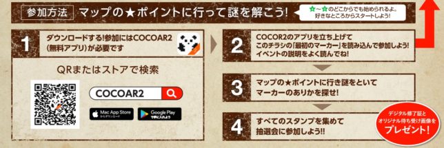その後下記エリア画像の「最初のマーカー」を読み込み、下記エリアのスポットのうちいずれかを尋ね謎を解いてマーカーのありかを探していく。マーカーを見つけたら同アプリで読み込みスタンプを獲得できる。