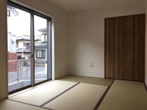 同棟の特徴が玄関ホールとリビングに通じる6帖のモダン和室。今日の住宅において和室スペースは狭くなりつつあるが、従来のスタイルでしっかりと6帖のスペースを確保している。