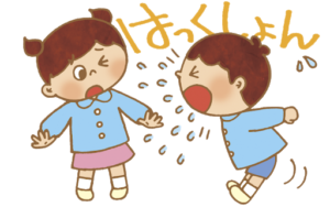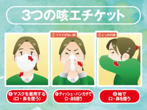咳などの症状がある場合は、咳やくしゃみを手でおさえると、その手で触ったドアノブなど周囲のものにウイルスが付着し、ドアノブなどを介して他者に病気をうつす可能性がある。それゆえマスクの着用やティッシュ・ハンカチ・服の袖で口や鼻を覆う咳エチケットが求められる。特に屋内などで、お互いの距離が十分にとれない状況で一定時間いる場合には心がけたい。