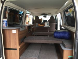 トヨタ系列ということで人気のハイエースをベースにした同車。家族揃ってのドライブや車中泊に対応できるよう中央のシートを操作して座席にしたりベットにしたりできます。