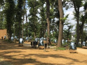 チームラボがインタラクティブな光のアートを演出。昼間は木々の間に置かれた卵形体のovoidが自立しつつも呼応する生命を表現し、夜は木々への幻想的なライトアップがなされ木の光が周囲に呼応する様を表現する。