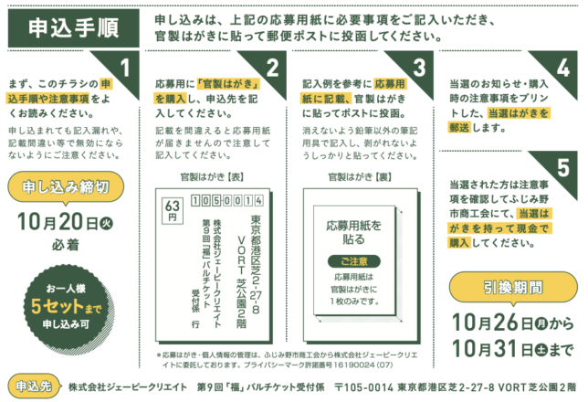 例年、産業祭にて前売りチケットを販売していましたが、今年はコロナウィルスで産業祭が中止になったため、限定3000セットのプレミアム商品券付きのバルチケット(800円×5枚+プレミアム商品券1000円付き)はハガキによる予約抽選販売となりました。