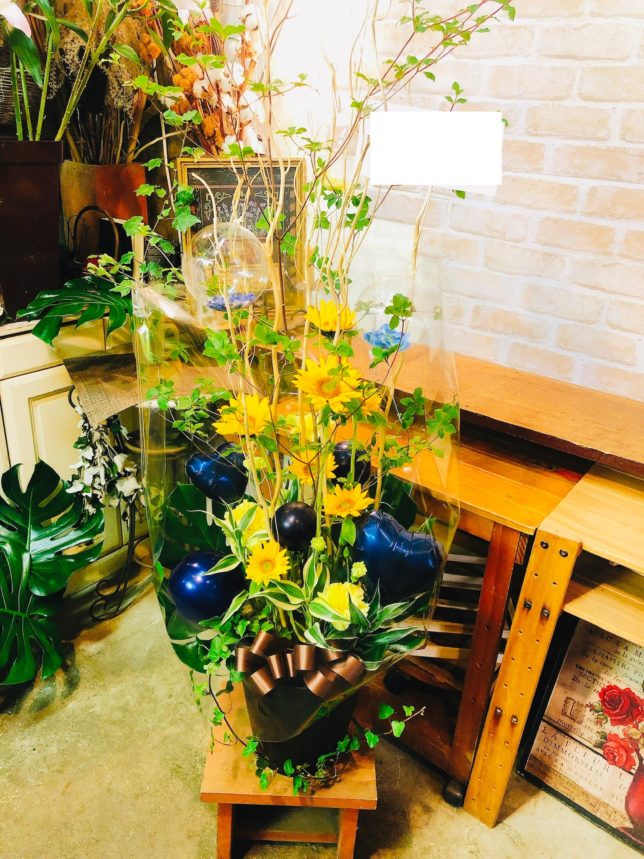 お友達のお店のイメージカラーのブルーのバルーンと、ブルーに映えるイエローのお花をあしらったアレンジメントがとっても素敵です。