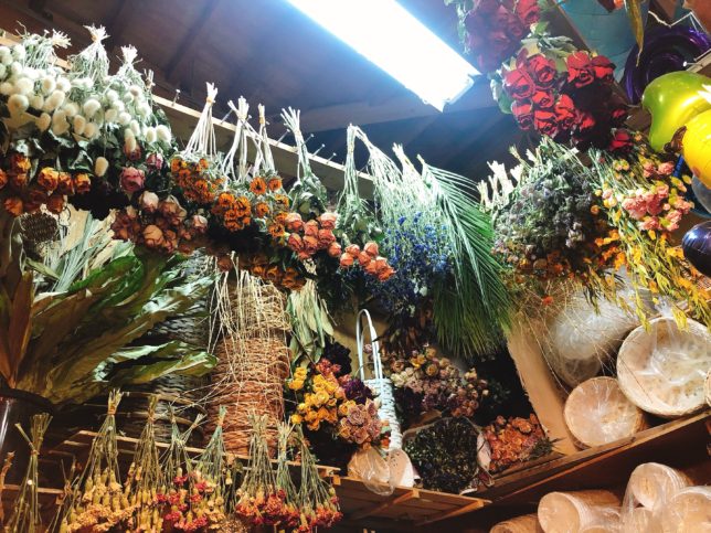 その広い頭上の空間に、たくさんのバルーンやドライフラワーが吊り下げられています。