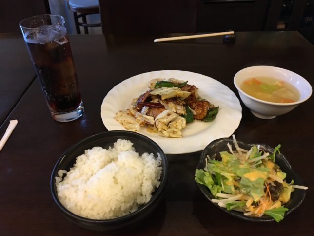 こちらが回鍋肉定食。回鍋肉にライス、サラダにスープから成ります。