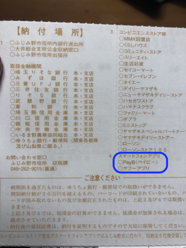 そしてこの支払い方法、税金の納付書だけでなくて、払込票の表面にバーコードの印字と、裏面に「ヤフーアプリ」の表記があるものが支払いできます😃