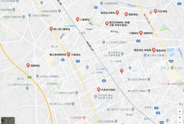 まず「ふじみ野市の神社」で調べると、思ったよりたくさんの神社があることがわかりました。
