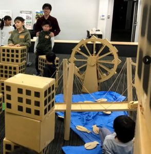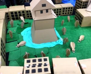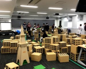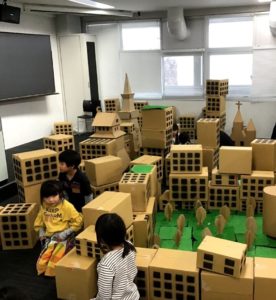 小学生を対象としてまちづくりに興味を持ってもらうために行ったイベントです。ビルや橋、学校などをダンボールで、川や海をブルーシートで、緑などの自然を人工芝でというように身近なものを使って理想のまちづくり体験を行いました。まちづくり体験は3部構成で行い、それぞれ「1人1人がそれぞれ理想のまちを創る」「全体を3つのグループに分けぞれぞれのグループで理想のまちを創る」「全体で1つの理想のまちを創る」という構成で行いました。