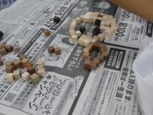寄木工作では、モザイクブロックを使って、コースターやペン入れ、眼鏡など子供たちに好きなものを作ってもらいました。