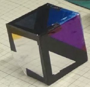 4.次に組み立てを行います。鏡面の保護フィルムを剥がし、鏡面が内側に来るように6枚のミラーを組み立てます。固定には不透明の黒ビニールテープを使うことで、3.で傷をつけた部分以外で光が入らないようにします。