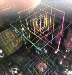上のような形をしており、角の1カ所に穴が空いています。そこから中を覗くと下のような模様、いわゆるラビリンス(迷宮)が広がっています。形を複雑にできればそれだけ深いラビリンスを創出できる万華鏡となっています!