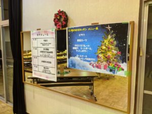 今月のメニューは、ピラフ、野菜スープ、クリスマスプレート(唐揚げ、ミートボール、マッシュポテト、ミニトマト)、ロールケーキでした!それ以外に、子供達にはセノビックの試飲がありました!大きく成長してほしいですね(*^_^*)