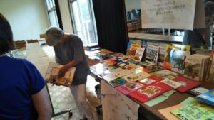 受付が終わった人から「古本市コーナー」にて親または子ども達に好きな絵本を選んでもらい持ち帰ってもらいました!たくさんの本を積み重ねて持っている子や様々な本を比べてお気に入りの1冊を選んでいる子も、、、