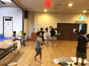 ステージの下では、自習・読書スペースやゲームコーナーを設けました!ゲームコーナーでは、オセロやトランプ、ジェンガや風船で一緒に遊びました!外遊びをしていた男の子も風船で思いっきり遊んでいて子どもの体力には敵いませんね^^;