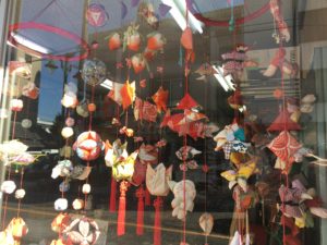 道の両端には多くの商店が並びますが、季節が季節だけに雛人形や吊るし雛を店頭に出しているお店を多く見かけます。これは同市域で2月中旬から3月上旬にかけて毎年行われている飯能ひな飾り展によるもの。