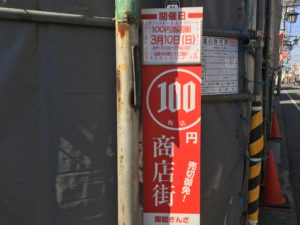 これは商店街に加盟する対象店舗が特定の日に100円で購入できる商品やサービスを数量限定で提供するというもの。商店街の活性化を狙って行われているイベントで、毎回大好評のようですよ。