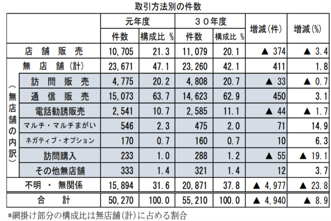 後者の内訳をみると、通信販売(同3.1%増)やマルチ・マルチまがい(同14.9%増)などで増加している。