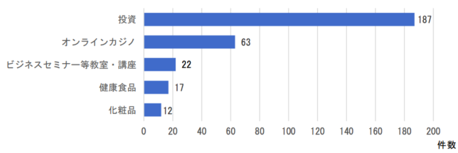 加えてオンラインカジノが63件(16.9%)と、商品のみならず儲け話などの情報が主流となっている。
