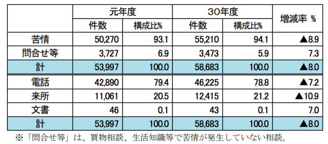 このうち相談種別別の受付件数を見ると、「苦情」が50,270件で全体の9割以上を占める。