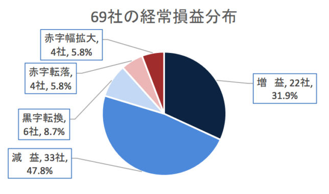 ただ黒字の内訳をみると増益が22社(構成比31.9%)に対し減益33社(同47.8%)と上回っており、黒字転換は6社に留まっている。なお、赤字の内訳は赤字転落4社・赤字幅拡大が4社という結果だった。
