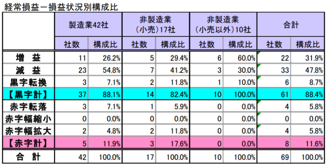 昨年度決算において経常黒字を果たした企業は61社(構成比88.4%)に対し経常赤字の企業は8社(同11.6%)で、ほぼほぼ経常黒字を達していた。