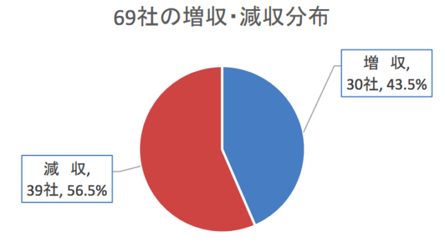 このうち前年度比増収となったのは30社(構成比43.5%)に対し減収は39社(同56.5%)減収企業が増収企業を上回る結果となった。