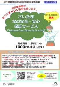 一般社団法人埼玉県物産観光協会(松本邦義会長)はテイクアウト・デリバリー事業に取り組む埼玉県内の飲食店に対して、クラウドファンディング型の保険「さいたま食の安全・安心保証サービス(Saitama Food Security Service:SFSS)」の提供を8/15より開始し、申込を受け付けている。