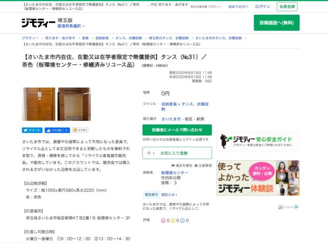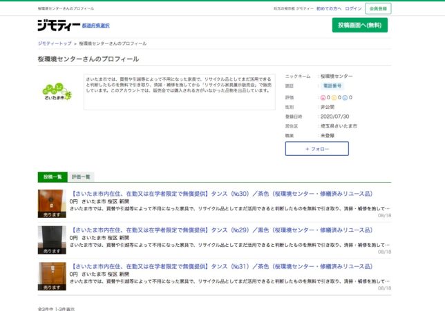 さいたま市が地域情報サイト「ジモティー」と連携して、桜環境センター(さいたま市桜区新開)で扱っているリサイクル家具の無償提供に乗り出している。