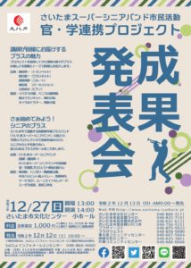 さいたま市文化振興事業団(南区根岸)は、同団がさいたまスーパーシニアバンドや城西大学と進めてきた「さいたまスーパーシニアバンド市民活動 官・学連携プロジェクト」の成果発表会を12/27(日)に南区・さいたま市文化センター小ホールにて開催する。