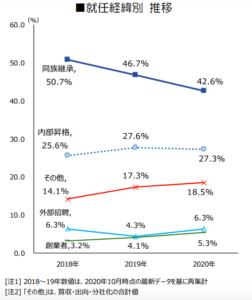 「同族間での事業引き継ぎから幹部社員など社内外の第三者人材へ少しずつシフトする傾向がみられる」と同社。