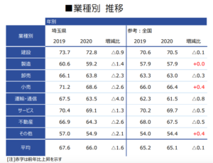 いずれも業種も前年比は低下しているが、同率が最も高いのは建設業で同0.9%減少の72.8%に上る。全国的にも同業種は同率が高く、埼玉に限った話ではないようだ。