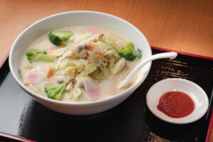 とんこつベースのスープに魚介系の旨味がしっかり出た、味わい深い一品。麺は日高屋独自の喜多方風の太麺を使用、具材は豚肉・キャベツ・白菜・玉ねぎ・にんじんなどを使用し、食べ応えにも応えた。中華鍋でサッと炒めた野菜の食感も楽しめる。