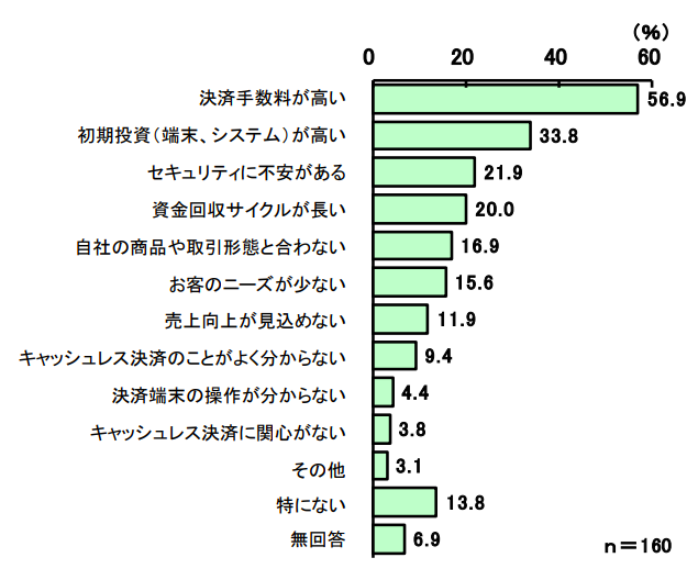 最も多かったのが決済手数料が高いことで、5割強を占めています。これに初期投資が高いこと(33.8%)やセキュリティへの不安(21.9%)、資金回収サイクルが長いこと(20.0%)が続きます。