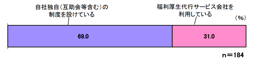 最近ではベネフィットステーションなど福利厚生代行サービスも多いですが、導入している事業所の69%は独自の制度を設けているといいます。コスト削減やメニューの関係など、独自に展開する理由は様々です。