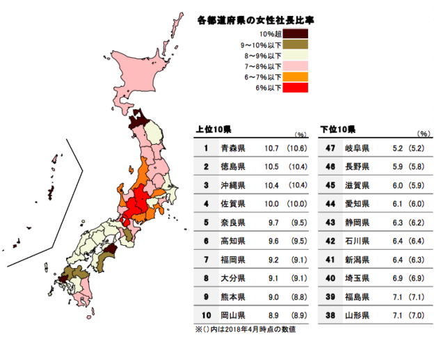 県内で女性が社長を務める企業は今年4月末時点で3,614社と推計されていますが、これは県内全企業数の6.9%に当たるといいます。30年前の1989年が3.6%であることを考えると倍近く成長していますが、依然として10%を下回っており、全国平均の7.9%も下回っている状況です。