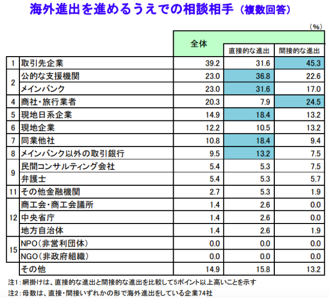 特に直接的な進出をしている企業では「公的な支援機関」への相談が36.8%で最高となっており、これは間接的な進出をしている企業(22.6%)を14.2ポイント上回っています。