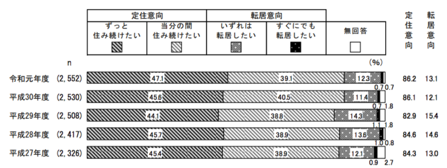 今の地域に「ずっと住み続けたい」と「当分の間住み続けたい」を合わせた在住者の定住意向はどうか。