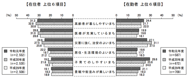 在住者では「高齢者が暮らしやすいまち」が、在勤者では「子育てのしやすいまち」がそれぞれ1位となった。