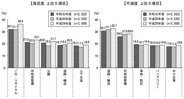 満足度は「ごみ・リサイクル」(32.1%)、不満度は「道路・輸送」(30.7%)が最も高かった。「市街地整備」は満足・不満度ともに2位に上がった。