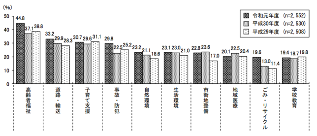 最も高かったのは「高齢者福祉」の44.8%で、「道路・輸送」が33.2%「子育て支援」が30.7%で続いた。