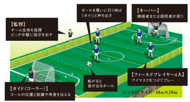 目が見えない分、一般的なサッカー・フットサルとルールは大きく異なる。