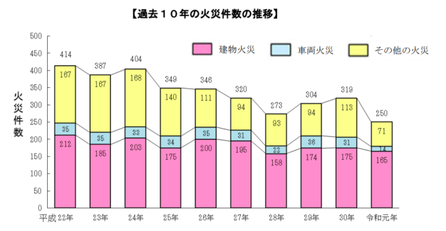 昨年1年に発生した火災の総数は250件で、前年2018年比で見ると69件も減少している。