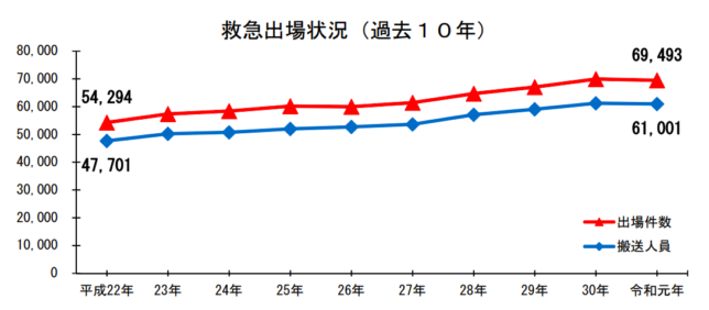 まずは年間を通じての出場件数と搬送人員だが、救急出場件数は69,493件で同462件減となった。