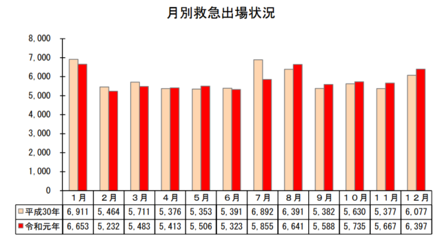 月別に救急出場状況を見ると、1〜3月及び6〜7月で前年比減となった。特に7月に至っては5,855件で、同1,037件減となった。